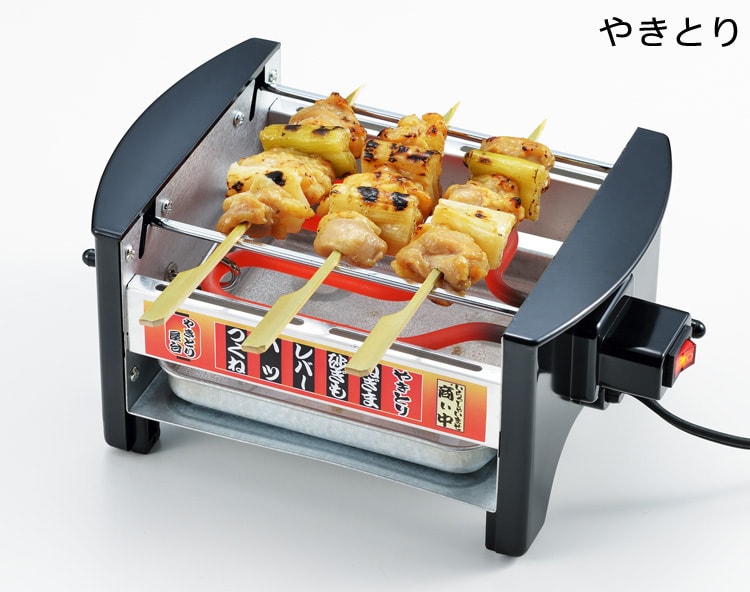 わが家でおいしく やきとり屋台。 ねぎま・砂ぎも・レバー・ハツ・つくね・モモ など お父さんの晩酌のお供におすすめ! 美味しすぎてお酒の呑みすぎに注意! コンパクトサイズで、一人でのご使用にもピッタリ!
