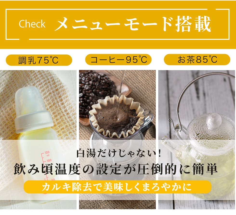 さらに、赤ちゃんの調乳やコーヒー・お茶など、好みの温度に簡単に設定できるので、忙しい朝でも手軽に「美味しいお湯」を楽しめます。