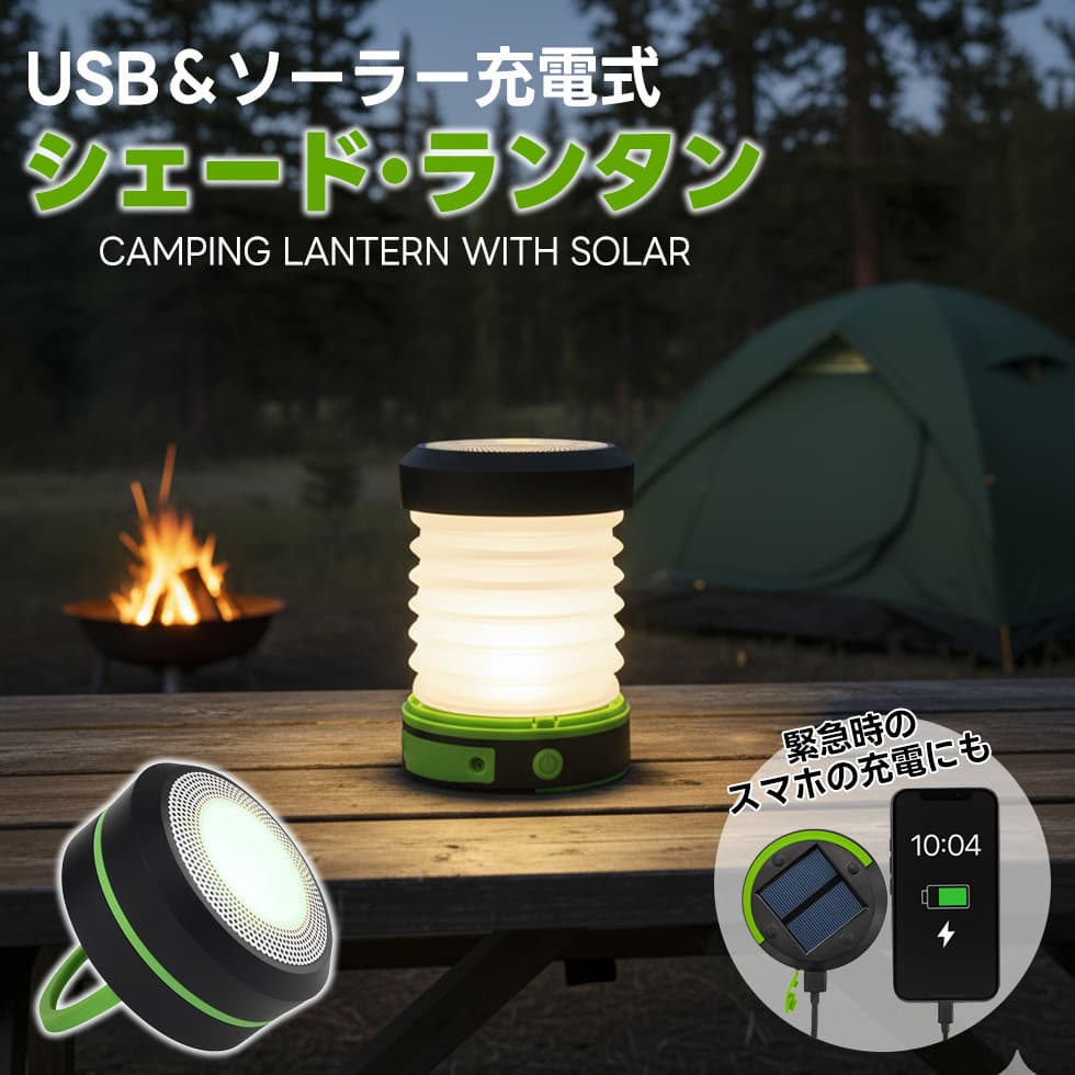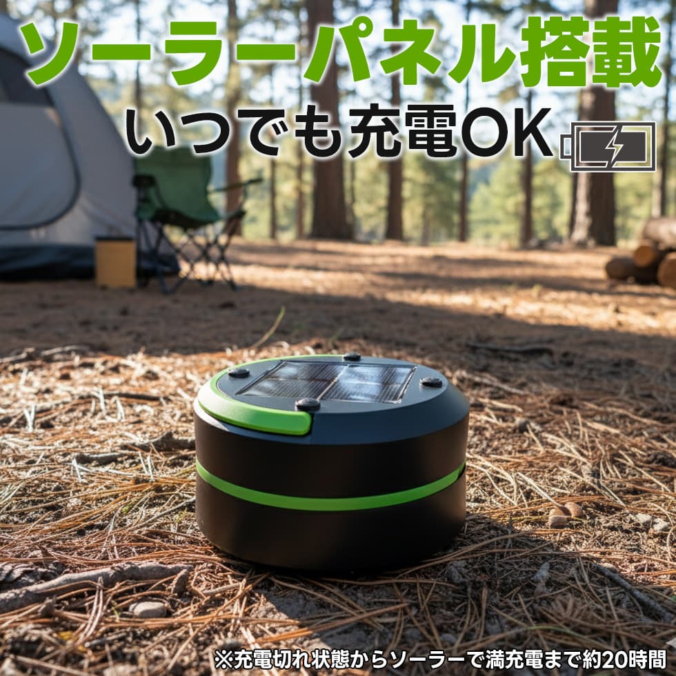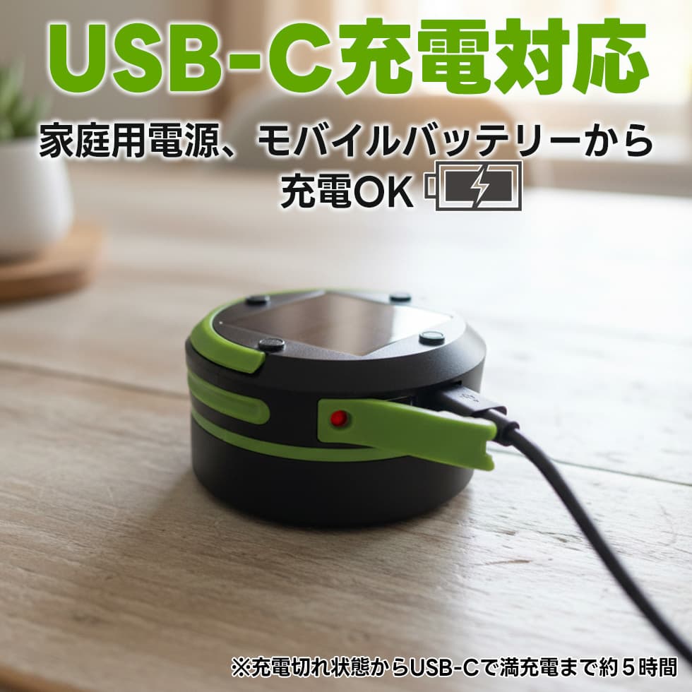 USB充電とソーラー充電の2WAY対応で、停電時やキャンプでも安心です。アウトドアや防災用として一家に一台あると便利です。