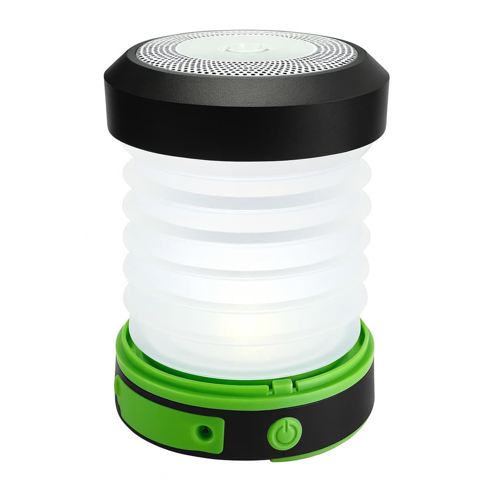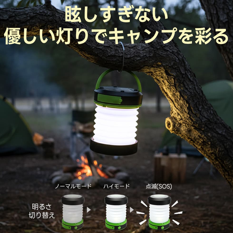 コンパクトで持ち運びしやすく、テントや車中泊でも大活躍。LEDライトで夜間の作業や読書灯にも使える万能デザインです。