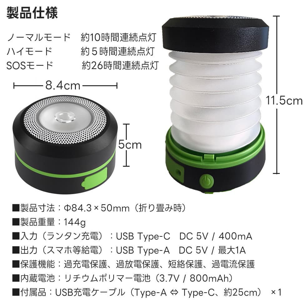●入力(ランタン充電):USB Type-C DC5V/400mA