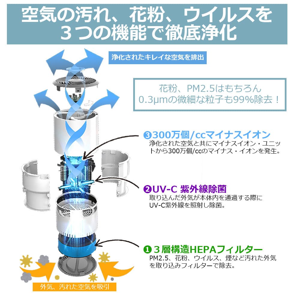 マイナスイオン&UV-C紫外線&3層HEPAフィルターのトリプル効果で、花粉やウイルスを99.9%除去!
