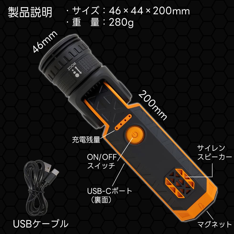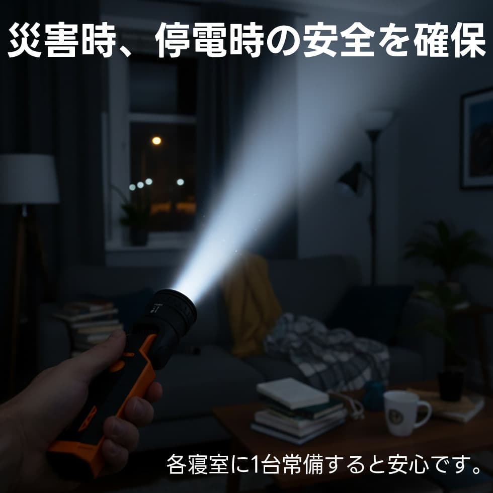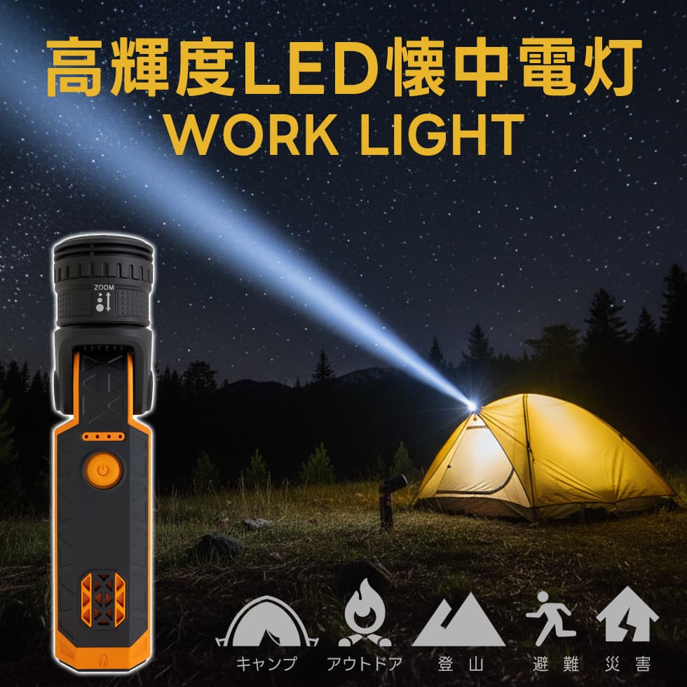 アウトドア・登山・防災・キャンプ・停電・夜釣り・熊避けなど、あらゆるシーンで使える万能LEDライト。USB充電式で経済的、強力な光であなたの安全を守ります。