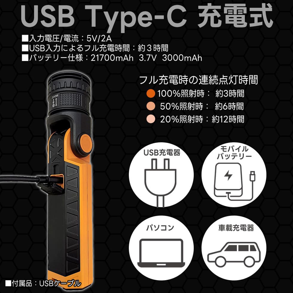 フル充電後の連続点灯(100%):約3時間