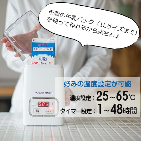 25~65℃まで1℃単位での温度設定と、最長48時間までの時間設定が自由にできるから、プレーン・ヨーグルト、カスピ海ヨーグルト、ギリシャヨーグルト、ケフィアヨーグルトはもちろん、甘酒、塩麹、納豆の発酵などの高温発酵にも対応しています。