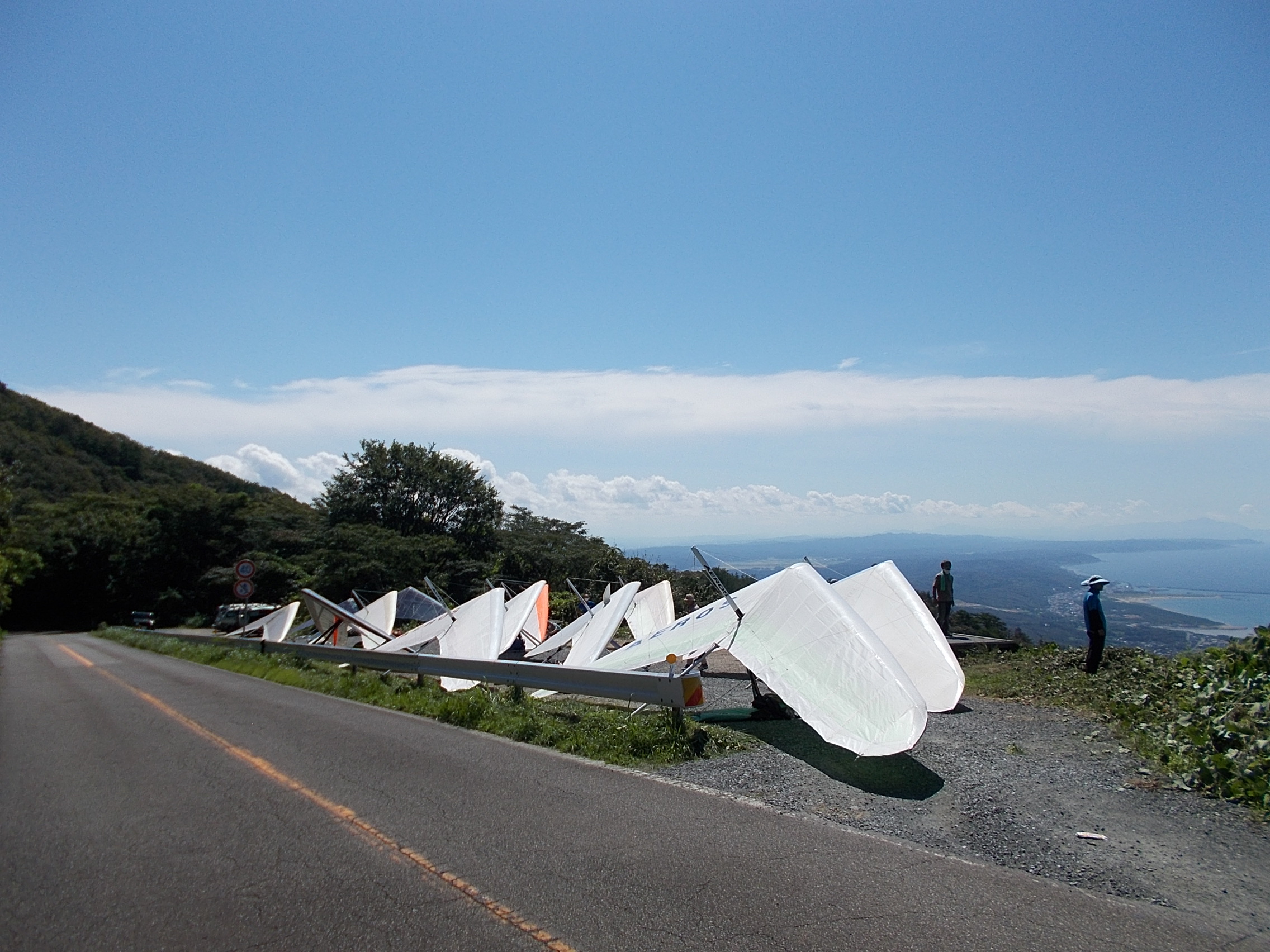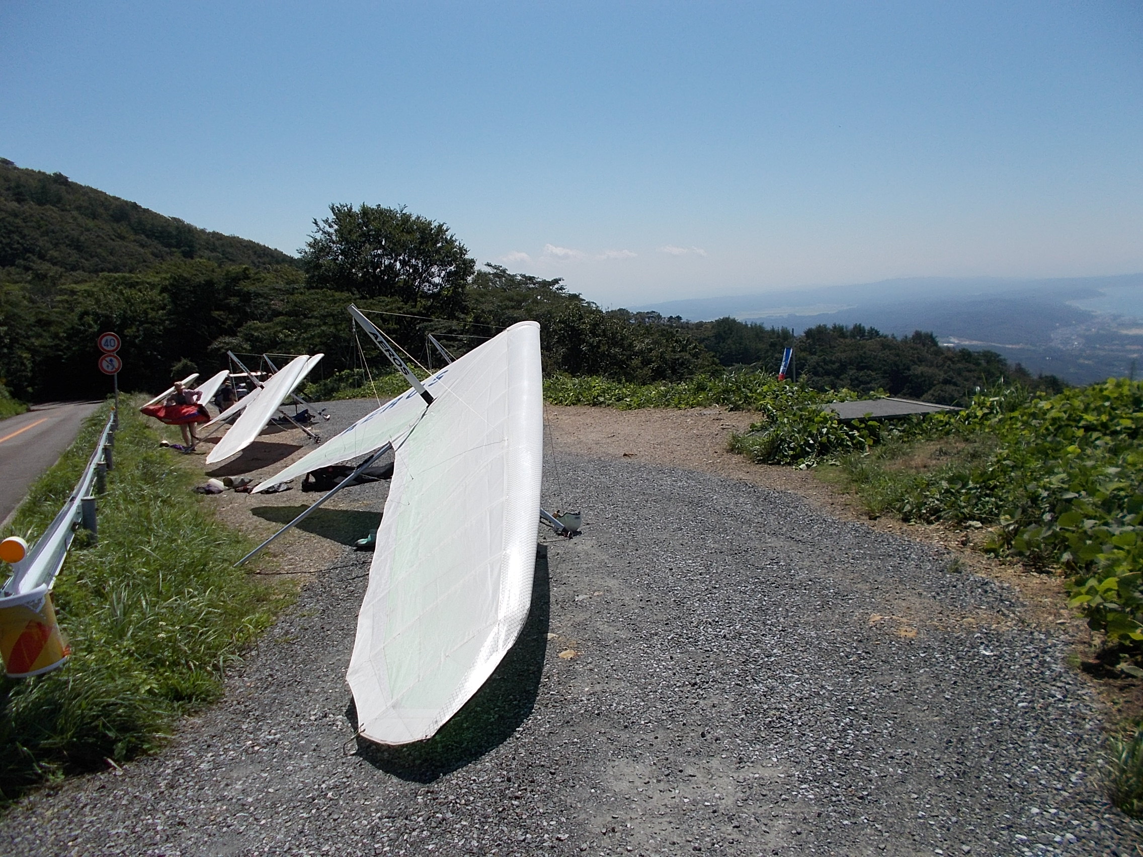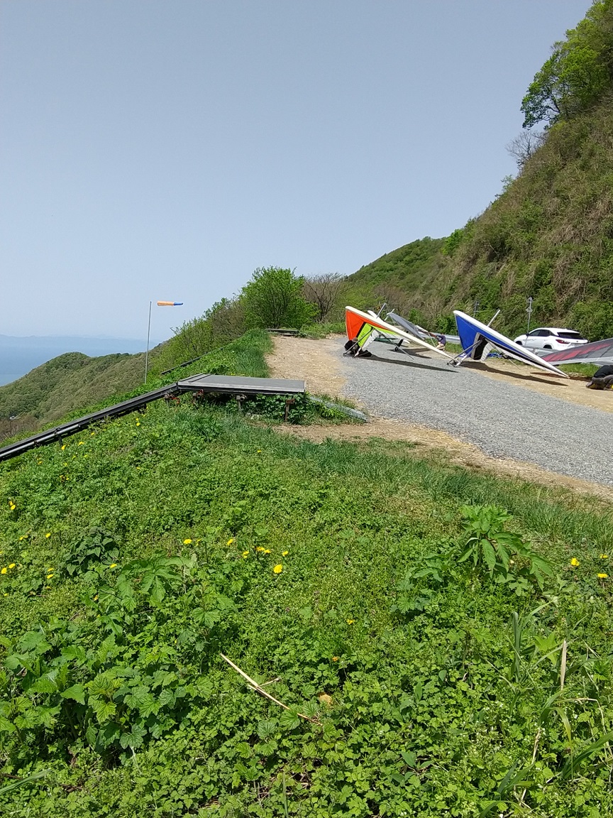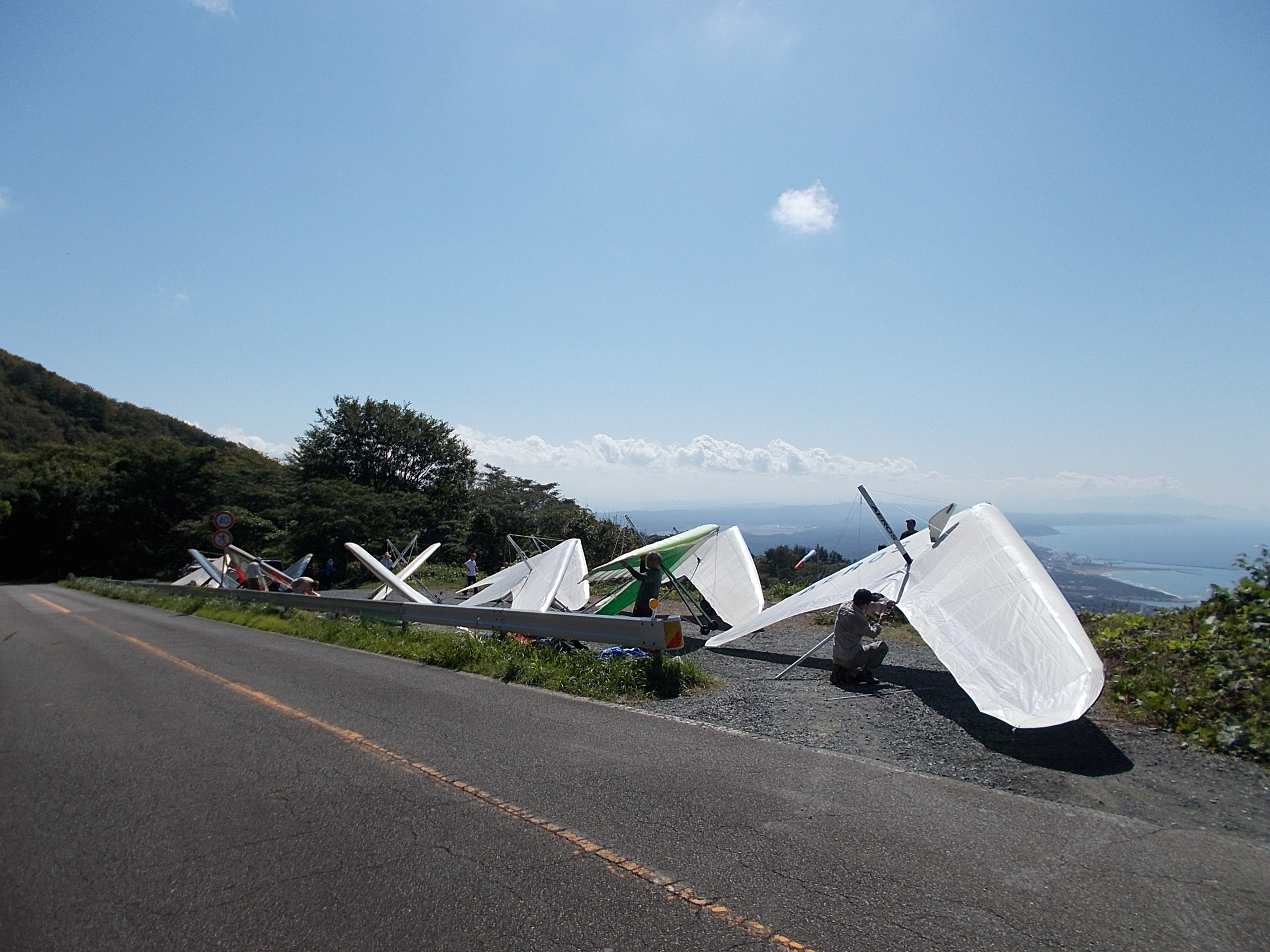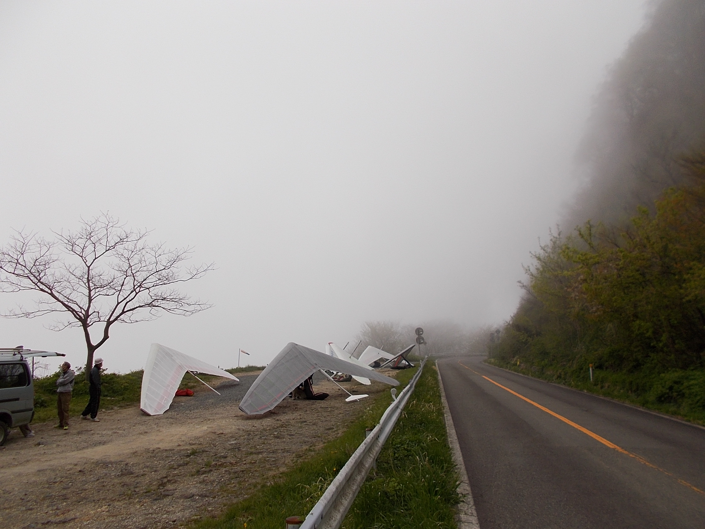 本日は飛ぶ気満々の校長を含め8名(MNM,ISD,HNM,INU,HSN,MRY,私)参集! 予報の良さ(真西4m)もあり、まだ山頂付近にガスが残る中 早々と10時半過ぎには登頂開始。 校長とISD氏の2台でGOGO!