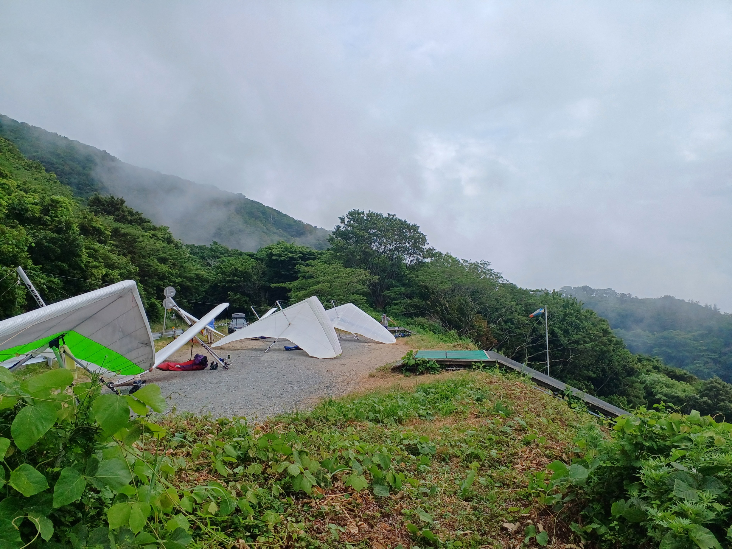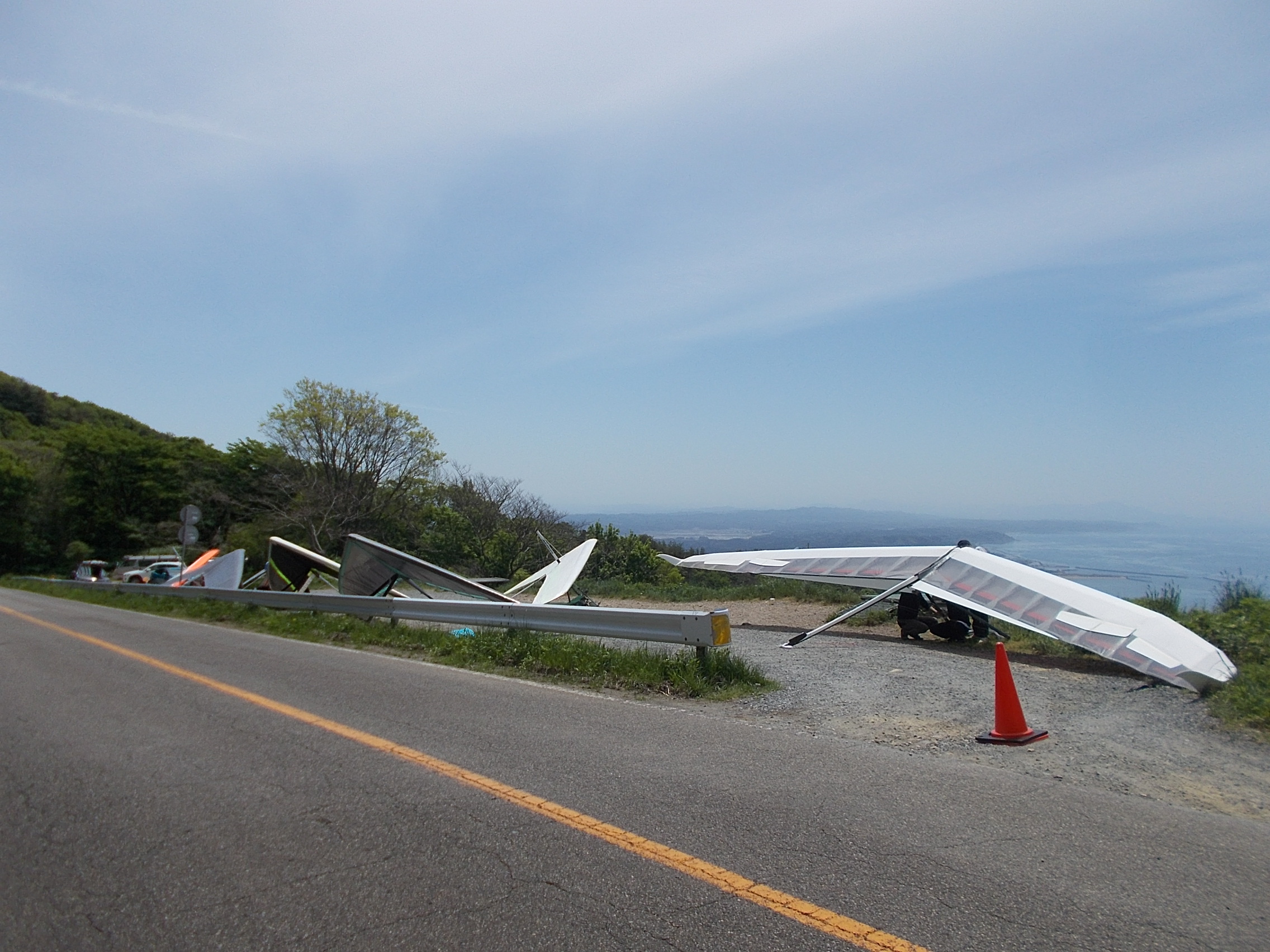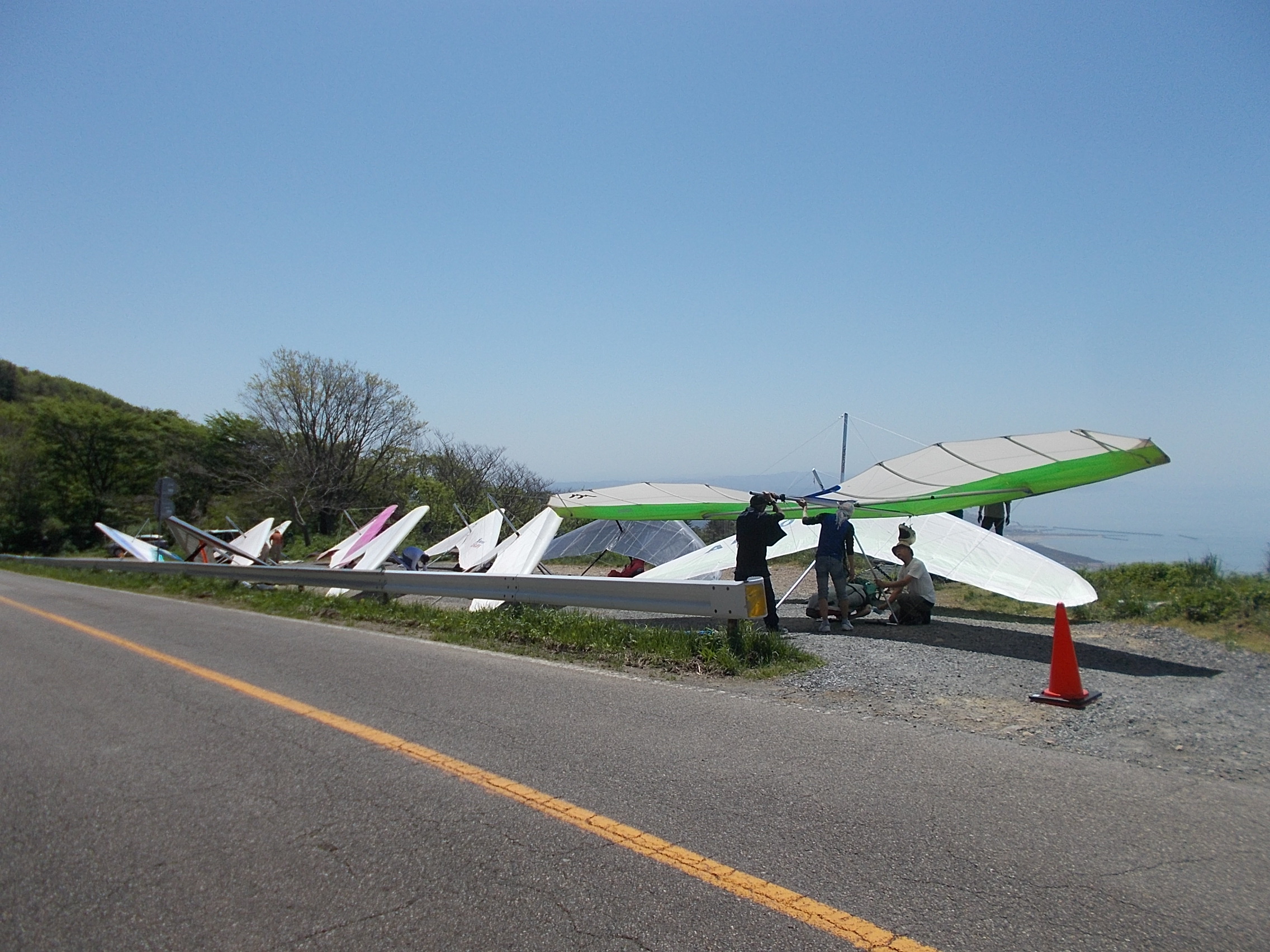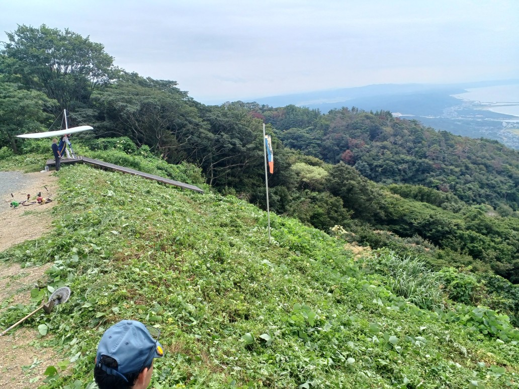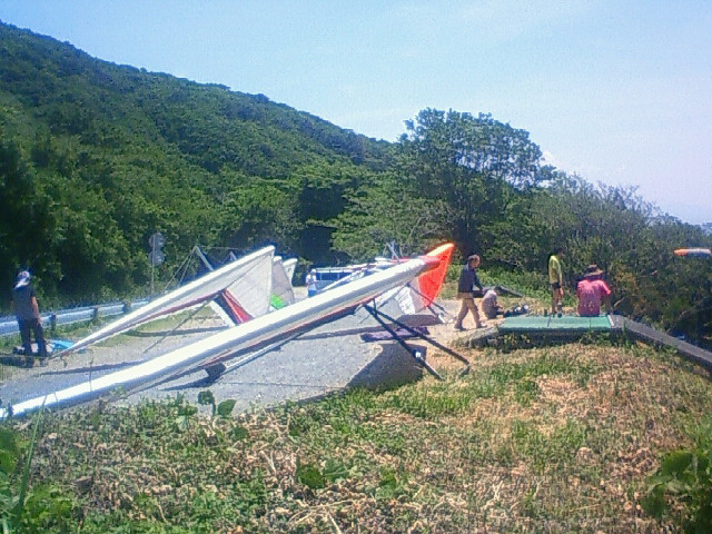 大会なのに悪条件予報で9名(ほぼ役員)集合!…ですが状況判断で競技員長が「大会中止!でフリーフライト!」宣言し『フライト希望者5』『草刈り希望者1』『サポート希望者3』それぞれの思惑で、校長号、ISD号、WSD号で出発!(^O^)/ TOいつもの到着時がベスト!曇りの中、北メインのブロー待ちで、一号機KRI発射!('◇')ゞ 弱いリフトあれど揚がらず滞空永めで北6〜7のエスカレーターランディング(^^)/ 続いて二、三、四号機同様(-_-;) ブローが弱くなりラストのATOS、2時過ぎまで待って断念(>_<)