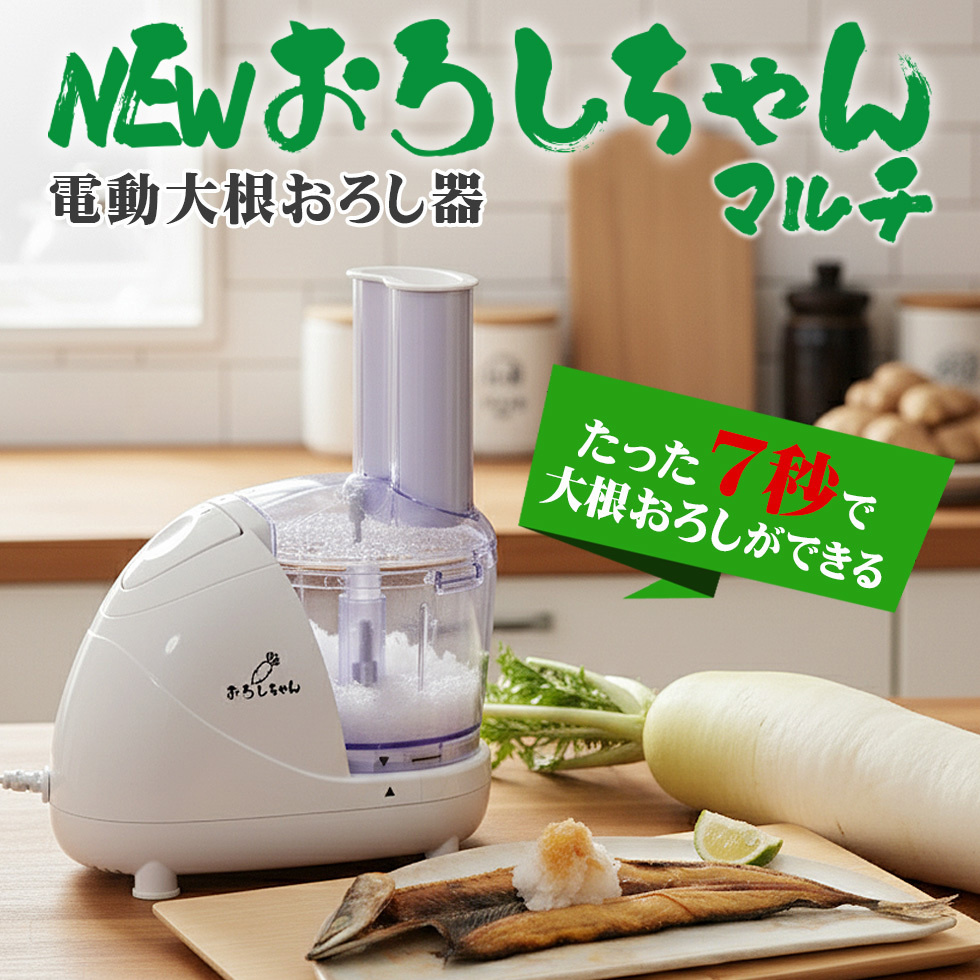 「おろしちゃん マルチ」は、おろす・きざむ・混ぜる・練るがこれ1台でできる電動マルチフードプロセッサーです。