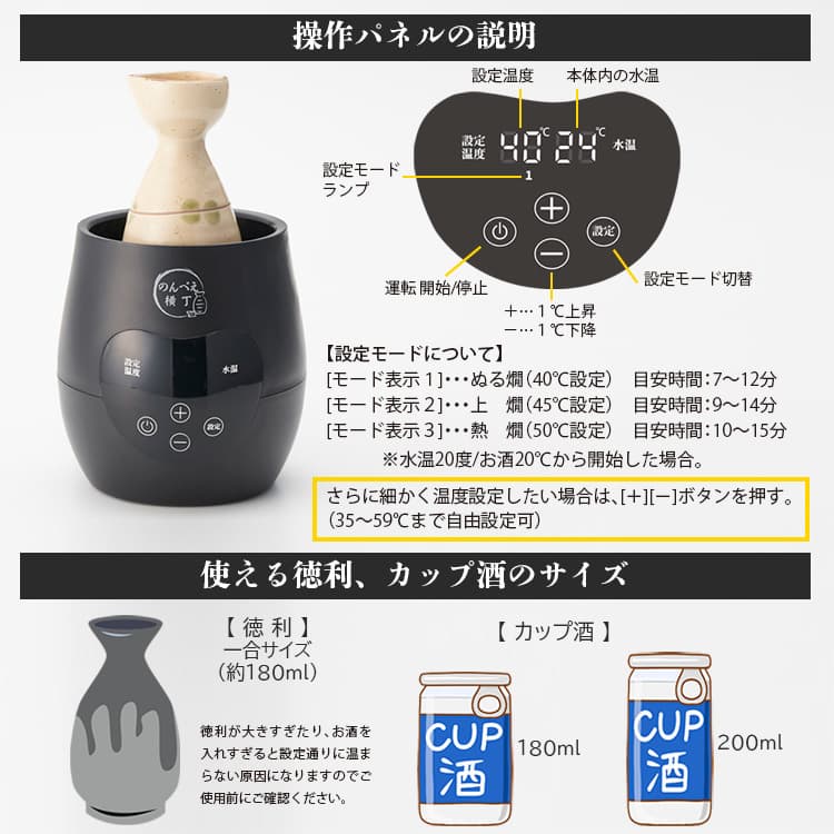 お好みの徳利でそのまま湯煎でき、温度設定も自由自在。呑み方や種類、食事に合わせて最適な温度で日本酒を楽しめます。
