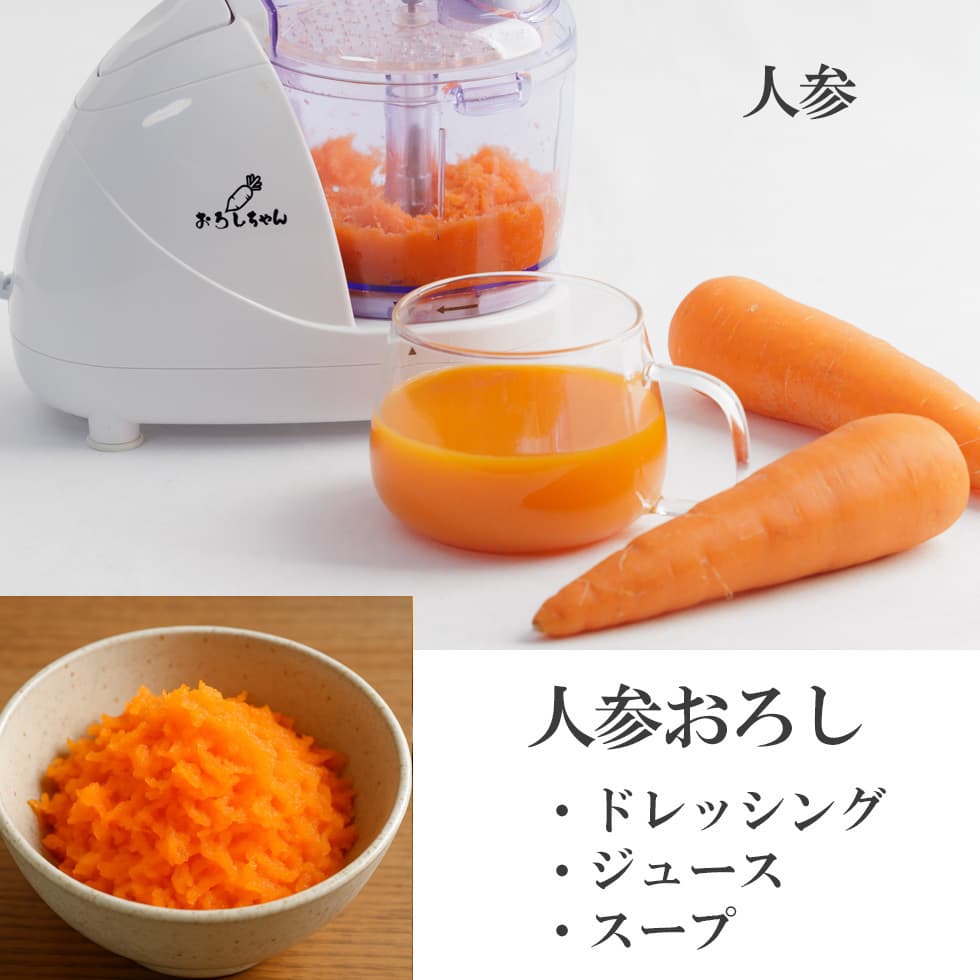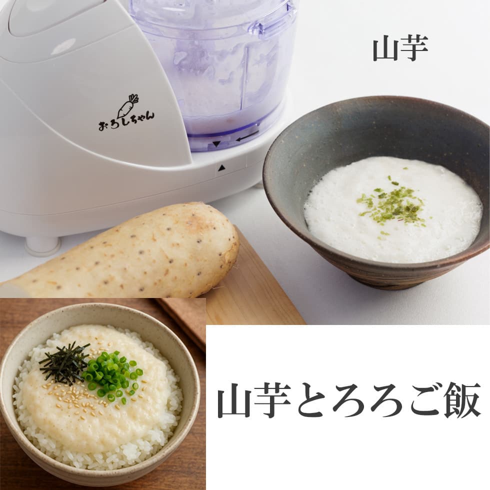 「おろしちゃん マルチ」は、おろす・きざむ・混ぜる・練るがこれ1台でできる電動マルチフードプロセッサーです。
