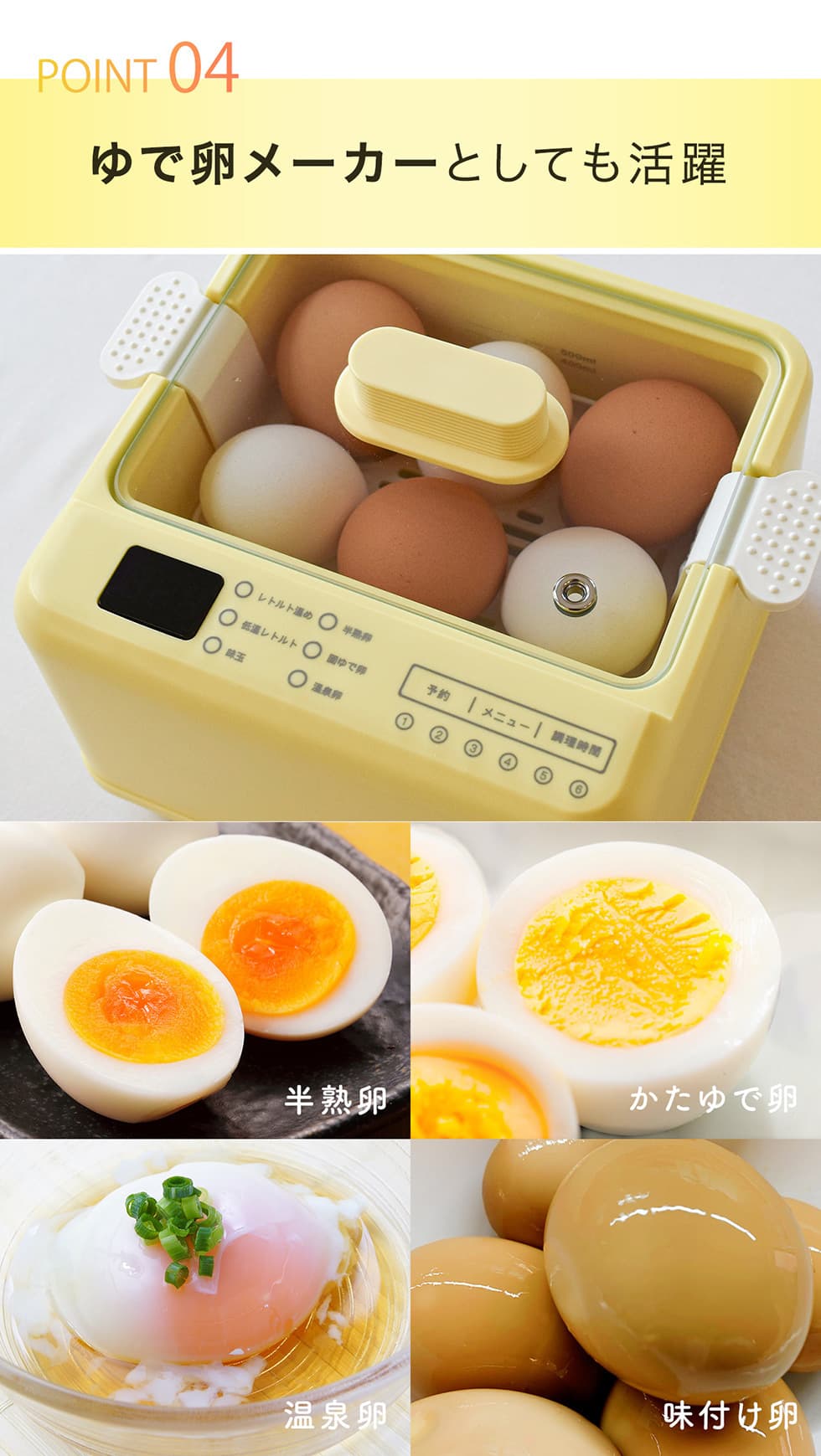 ■【幅広い湯煎調理に対応】各種ゆで卵や哺乳瓶・介護食・ペットフードの温めにも。タイマー機能も搭載