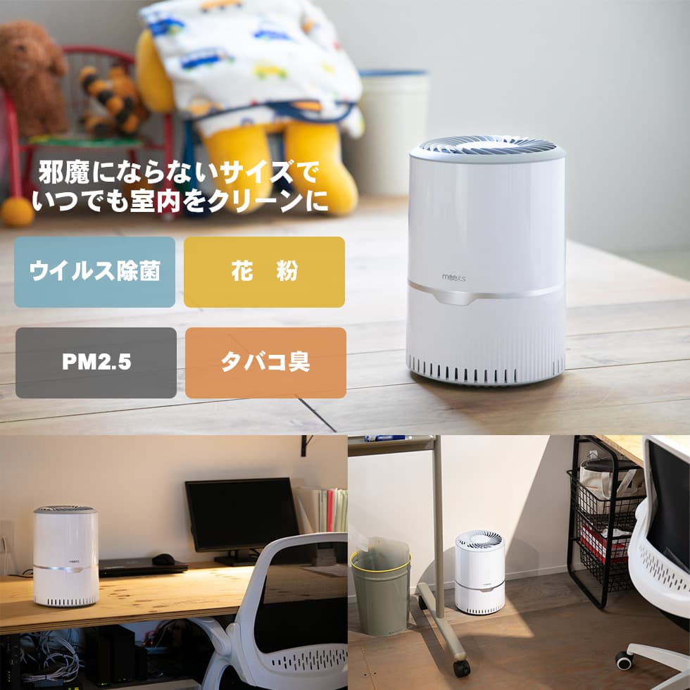 デスクや枕元に置くだけで、あなた専用のクリーンな空間を作れる、コンパクト空気清浄機です。