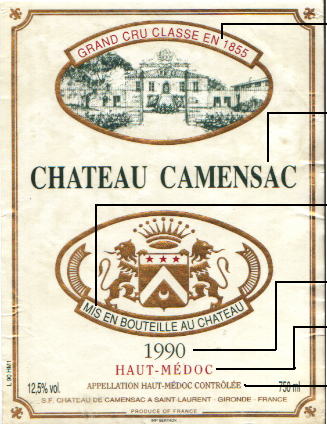 第一級格付け (グラン クリュ クラッセ) ボルドー、オーメドック地区の中で1885年に「グラン クリュ」に格付けされたことを示します。 銘柄名(シャトー・カマンサック) このワインを造ったシャトーの名前で、同時に製品名となります。原料のぶどうはこのシャトー内で収穫されたものに限ります。 Mis en bouteilles a la Propriete シャトー元詰め シャトーが直接瓶詰めをしたという意味です。 収穫年(ヴィンテージ) オー・メドック ボルドーのオー・メドック地区で醸造されたことをしめします。 オーメドック地区のA.O.C. ボルドー、オー・メドック地区で醸造され、その土地にふさわしい個性を持っていることを示します。 |