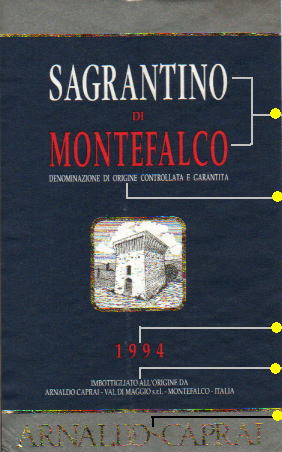 銘柄名 (サグランティーノ・ディ・モンテファルコ) D.O.C.G. Denominazione di Origine Cotrollata e Garantita (デノミナツィオーネ ディ オリジーネ コントロッラータ エ ガランティータ) 統制保証原産地呼称 特に高品質として政府が保証した地域のワインであることを示します。 収穫年(ヴィンテージ) Imbottigliato All'Origine De Arnaldo Caprai-Val Dimaggio s.r.l.-MONTEFALCO-ITALIA 生産者元詰め 生産者名 (Arnaldo-Caprai) |