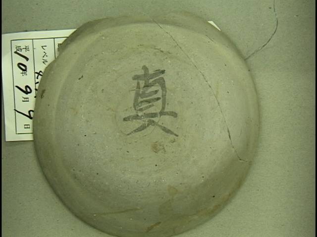 文字の書かれた杯〜墨書土器(ぼくしょ) 出土品の中で、土器の底に墨で文字の書かれた墨書土器(ぼくしょどき)が数点発見されました。大きさは直径約20センチメートルほど。土器の種類としては、須恵(すえ)器。
