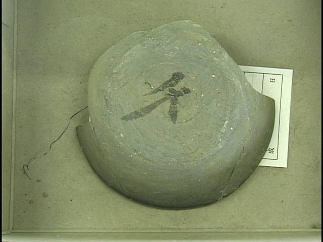 文字の書かれた杯〜墨書土器(ぼくしょ) 墨で文字の書かれた墨書土器(ぼくしょどき)を含む須恵(すえ)器は、北側の遺跡からたくさん発見されている。写真の大きさは、直径約20センチメートルほど。