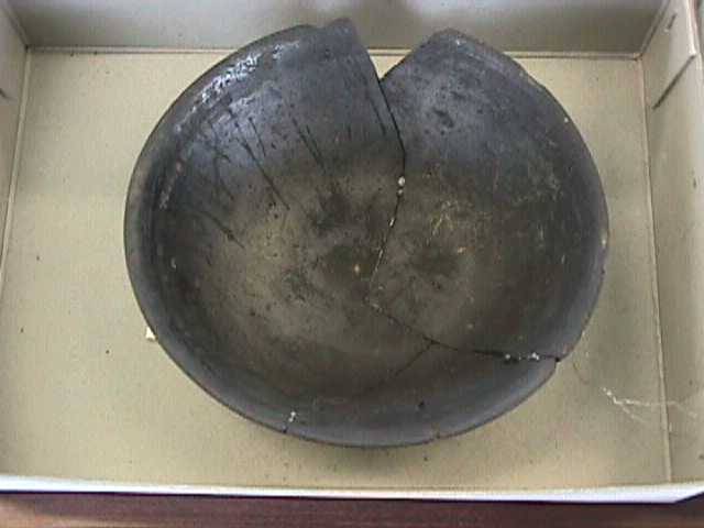 黒い土器〜黒色土器(こくしょくどき) 下のように色づけされた黒色(こくしょくどき)は、南側の遺跡から発見されている。土器の種類としては、土師(はじ)器に入る。直径約20センチメートルほど。