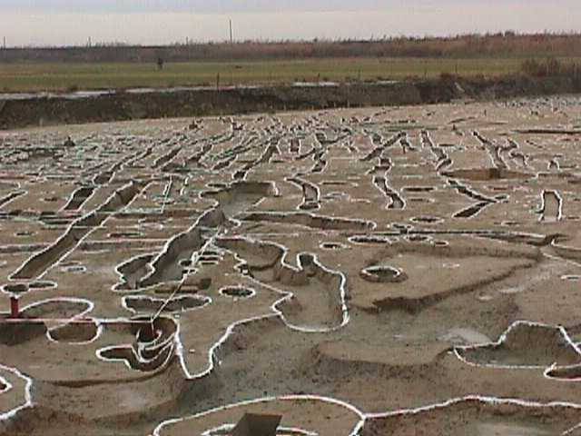たくさんの建物あと〜掘立柱建物跡(ほったてばしらたてものあと) 馬越遺跡から、約400基ほどのピッド(小穴)が発見されました。そのうち、建物跡と認定されるものは、北側の遺跡で、約3〜5基ある(南側は3〜5基)。建物の広さは、大体2間×2間程度。中には、2間×4間以上の大きいものも見られ、集落の中で特別な建物であった可能性もある。